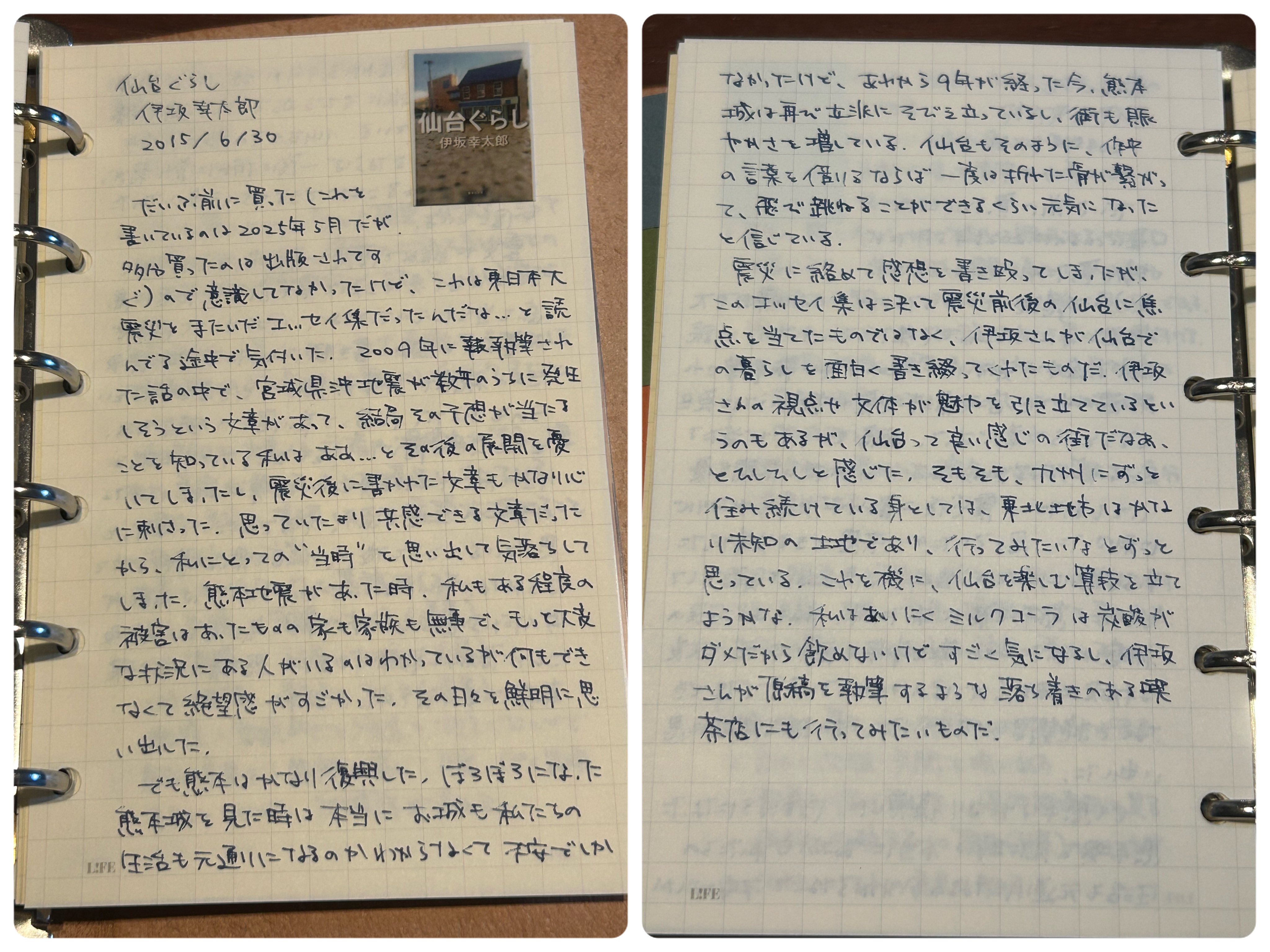 震災に絡めて感想を書き殴ってしまったが、このエッセイ集は決して震災前後の仙台に焦点を当てたものではなく、伊坂さんが仙台での暮らしを面白く書き綴ってくれたものだ。伊坂さんの視点や文体が魅力を引き立てているというのもあるが、仙台って良い感じの街だなあ、とひしひしと感じた。そもそも、九州にずっと住み続けている身としては、東北地方はかなり未知の土地であり、行ってみたいなとずっと思っている。これを機に、仙台を楽しむ算段を立てようかな。私はあいにく炭酸がダメだからミルクコーラは飲めないけどすごく気になるし、伊坂さんが原稿を執筆するような落ち着きのある喫茶店にも行ってみたいものだ。 #手帳 畳む