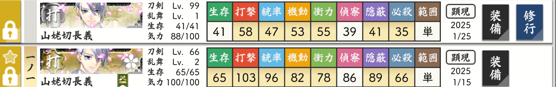 1振り目は一番最初に手に入れた長義くんで、100振プレゼントの個体 極カンスト目指してすくすく育っている #とうらぶ